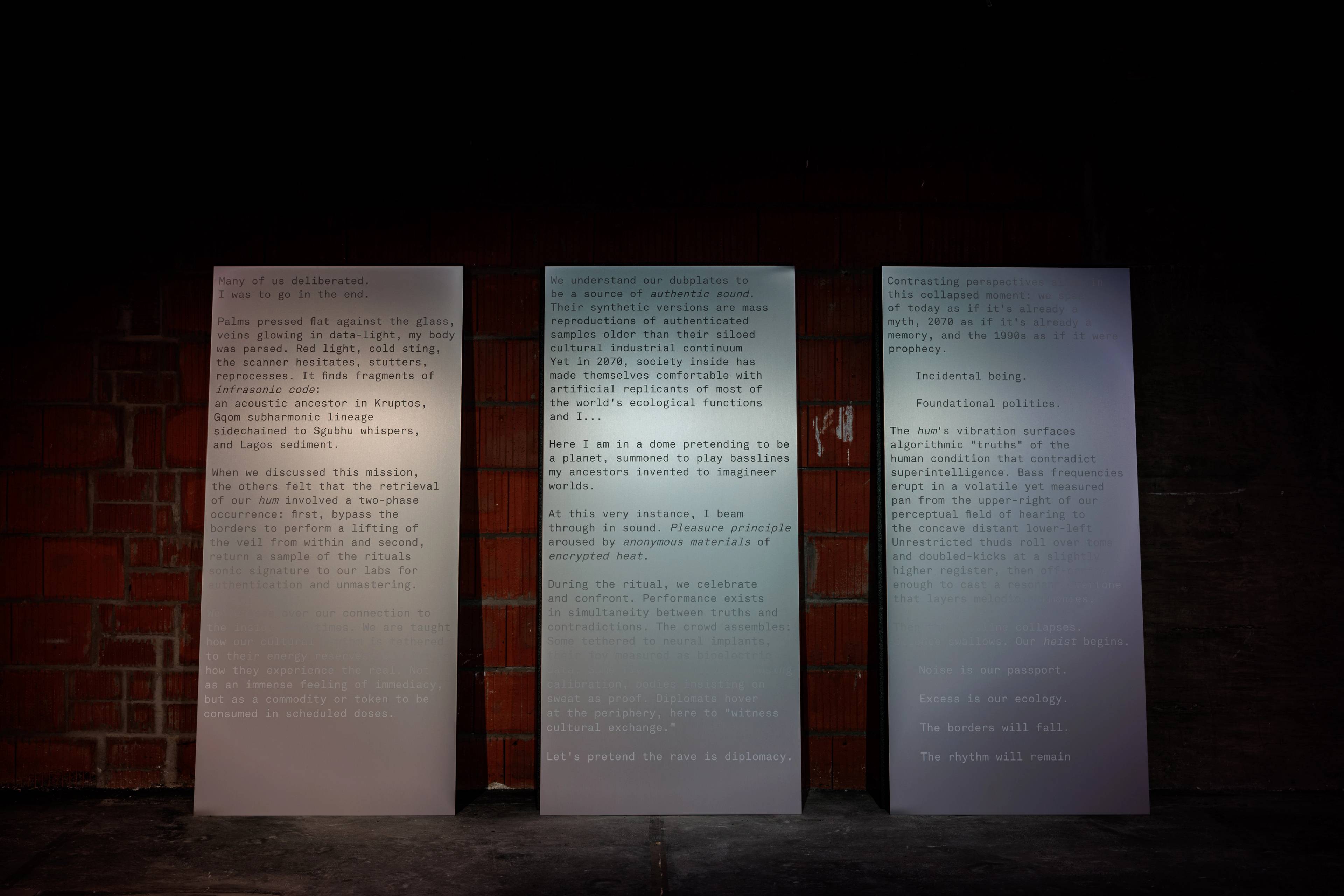 CEL understands art as a space for experimenting with alternative forms of organisation and imagination. They invite local and international collaborators to, in author Octavia Butler’s words, “write themselves into” a precarious future. Expanding on CEL’s inquiry into sonic ecologies and diasporic myth-making, the events and the space dedicated to Foundations at CANK are informed by a science-fiction short story conceptualised during research workshops with writer DeForrest Brown Jr and political scientist Jeff Kwasi Klein. Set in a speculative future and displayed on reflective panels, the short story centers on the theft of a cultural artefact known as “the hum”, and one character’s heist to recover it.